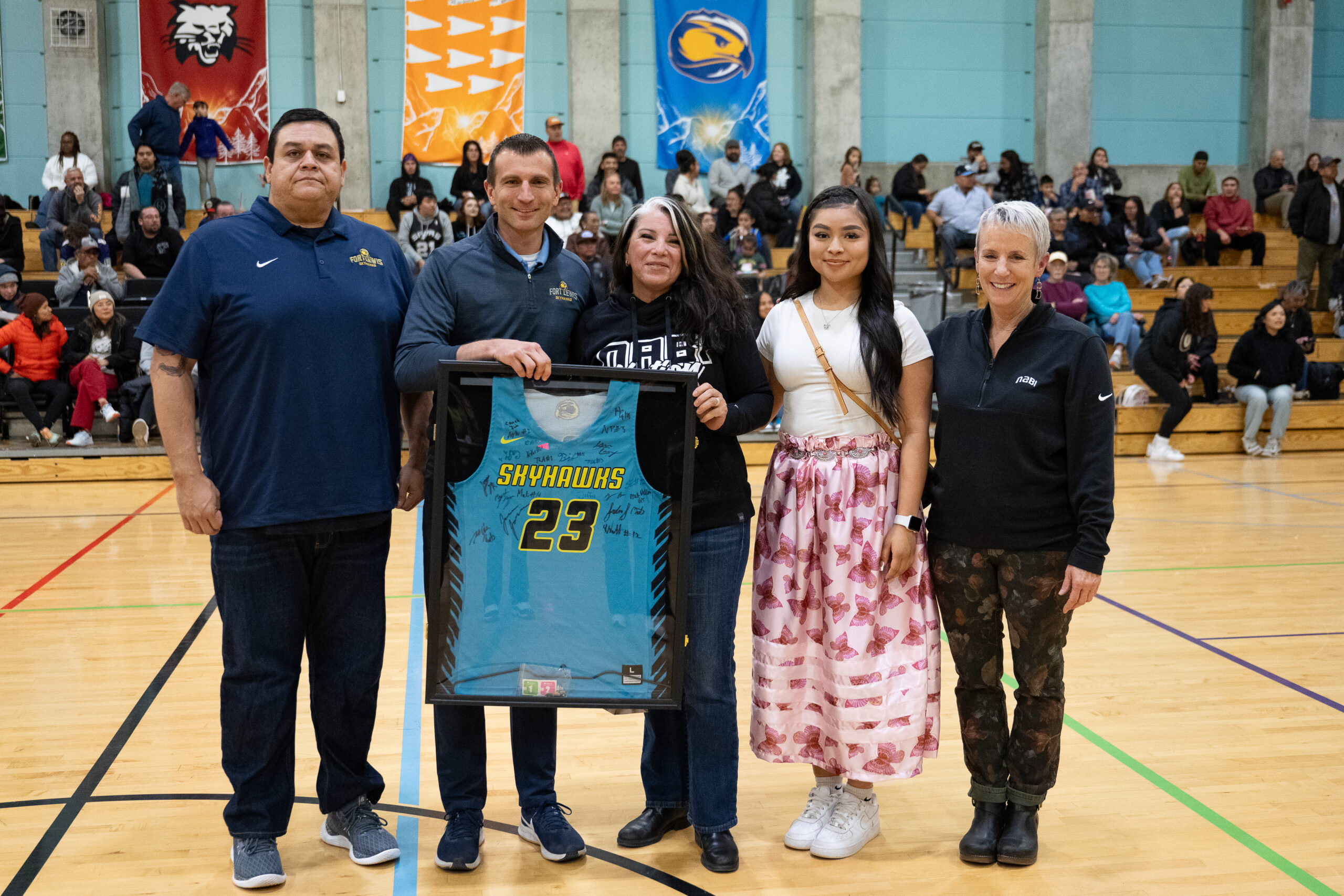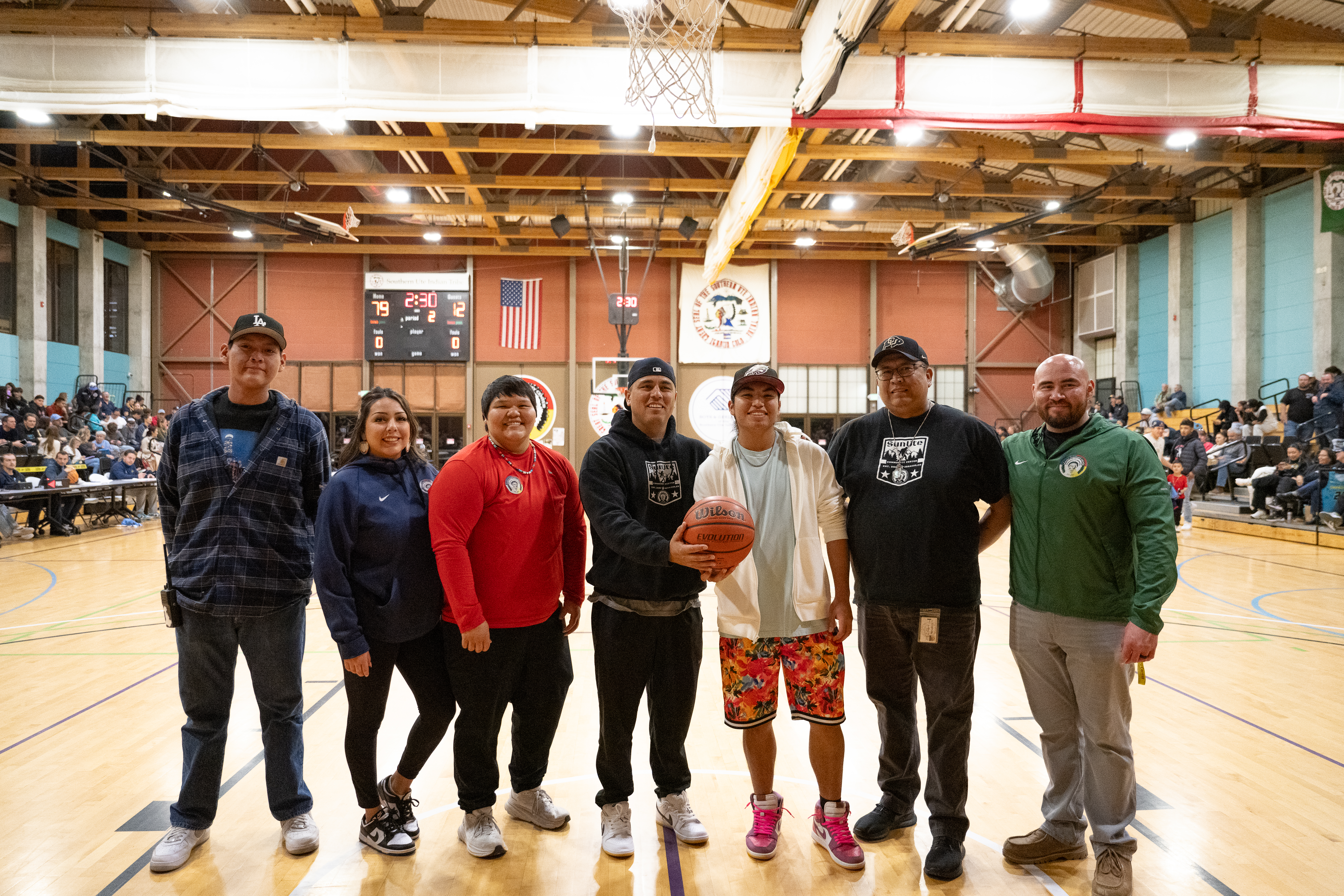 SunUte Community Center hosted the Fort Lewis Skyhawks and Navajo Tech Skyhawks on Saturday, Jan. 4 for the returning Native American Heritage NCAA Games powered by NABI Nation. This event featured a free throw contest, concessions, and men’s and women’s collegiate games for an exciting evening of free family fun. Paying homage to the Southern Ute Indian Tribe and its cultural practices the Southern Ute Veterans Association, Southern Ute Royalty, and Stoney White Thunder-Lucero kicked off the evening with a powwow style Grand Entry performance ahead of the games. SunUte Staff and Southern Ute Royalty also gifted bundles of traditional medicine to both teams and their coaches, showing gratitude to the athletes. Once again, the Native American Heritage NCAA Games filled the SunUte gymnasium with spectators and families for this free event.