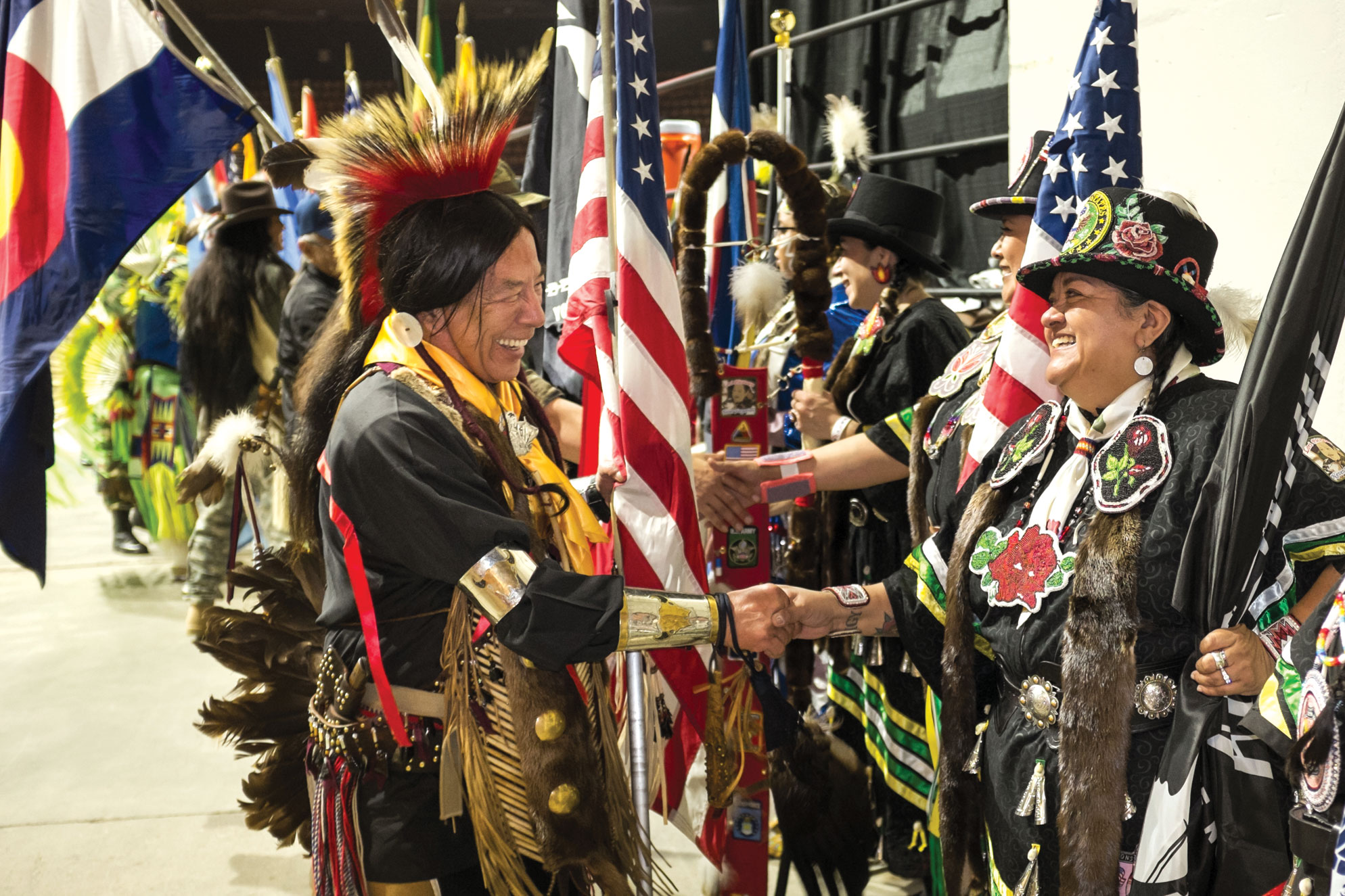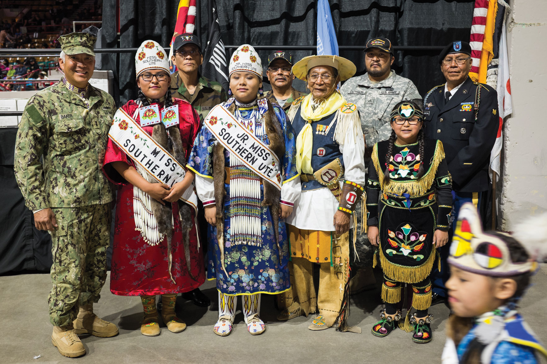Members of the Southern Ute Veterans Association stand together with Southern Ute Royalty at the Denver March Powwow.