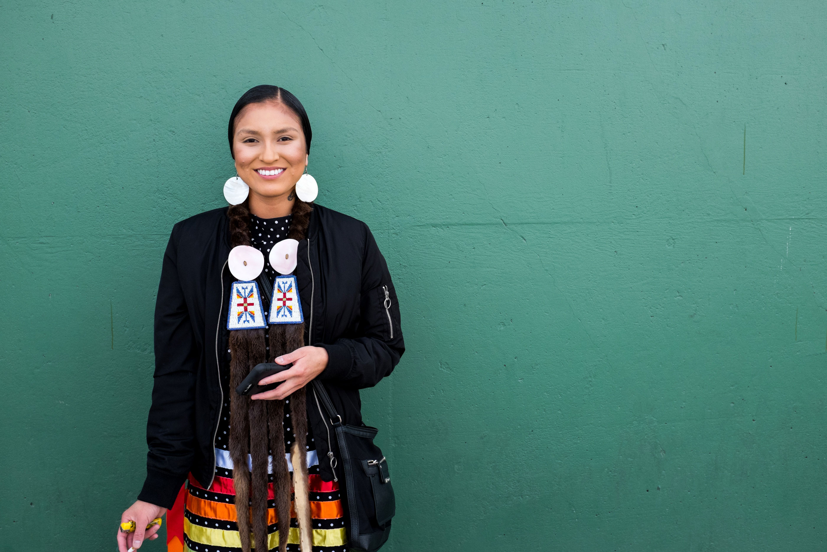Jr. Miss Southern Ute Alexandria Roubideaux greets spectators ahead of the Grand Entry in Denver, Colo.