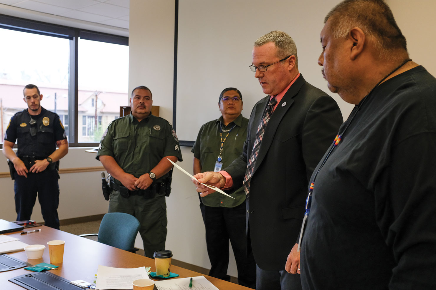 Southern Ute Vice Chairman Alex S. Cloud signs and presents the Law Enforcement Appreciation Week proclamation alongside Justice & Regulatory Director Chris Mimmack, and members of the Justice and Regulatory Department on Wednesday, May 10.