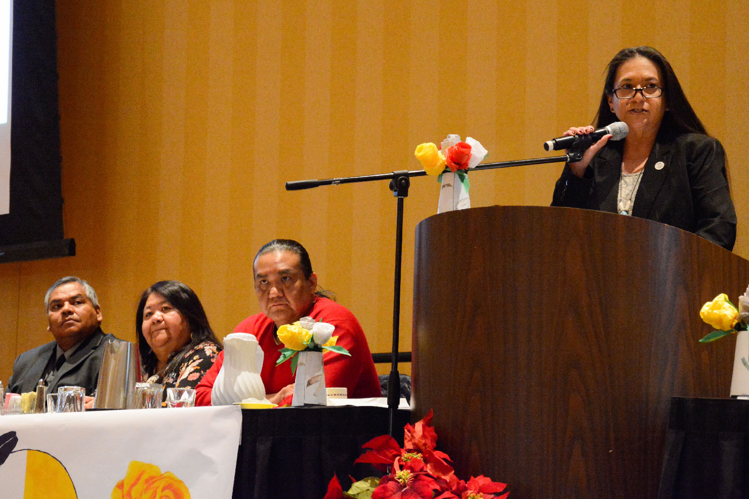 Southern Ute Chairman Christine Sage gives her first speech after being sworn into office joined by the newest council members Cedric J. Chavez (far left) and Cheryl A. Frost.