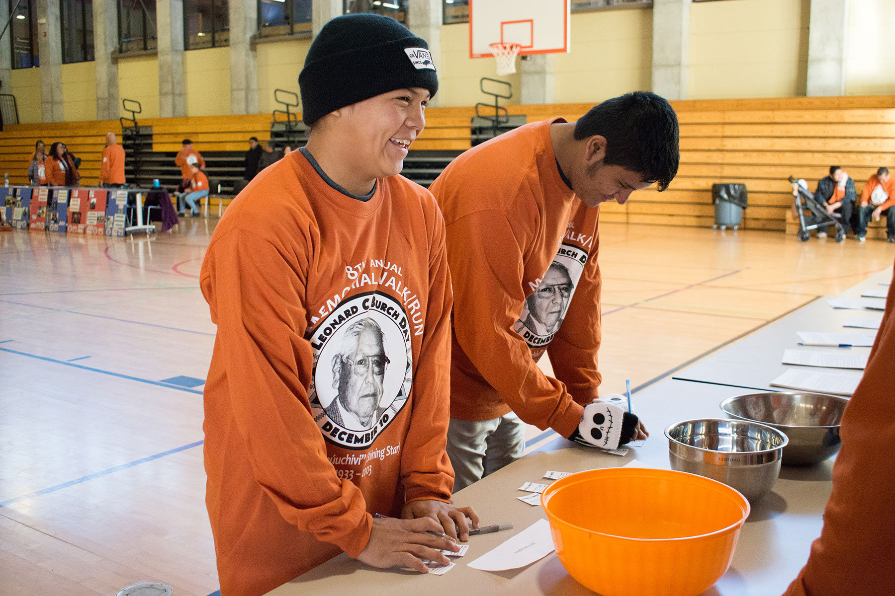 Nate Hendren and Marcus Archuleta sign up for the raffle drawing before the 8th annual Leonard C. Burch Memorial Walk begins.