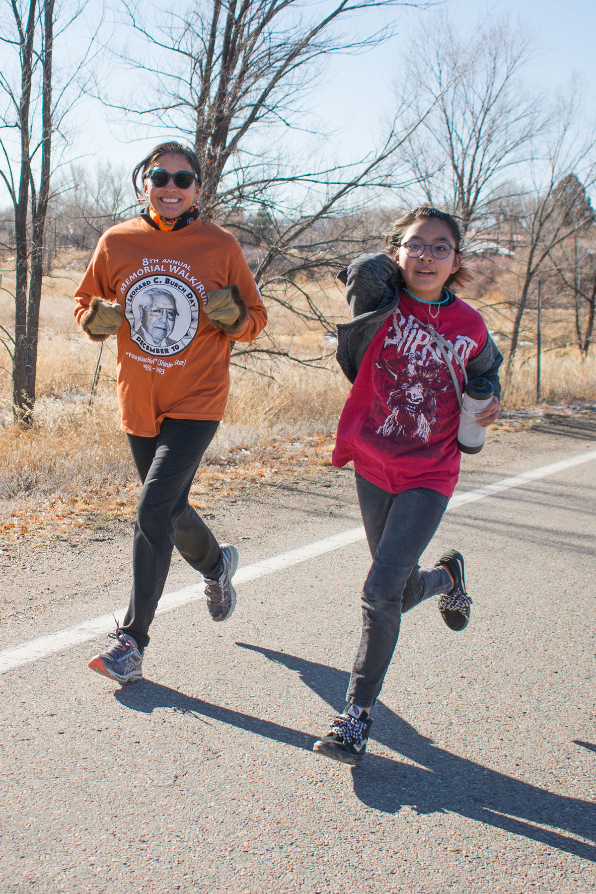 Southern Ute Tribal Council Treasurer, Lorelei Cloud walks in the Leonard C. Burch Memorial walk with Anthony Box.