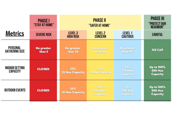 The revisions to the key metrics and restrictions support a move to Phase III “Protect Our Neighbor,” which is one phase below the Fully Open phase. The IMT will continue to monitor the data closely and provide the tribal leadership with the most up-to-date information in an effort to support the tribal reopening while prioritizing the health and safety of the tribal membership, employees, and visitors. The following graphic outlines the Key Metrics and Restrictions to be followed during each of the Phases.