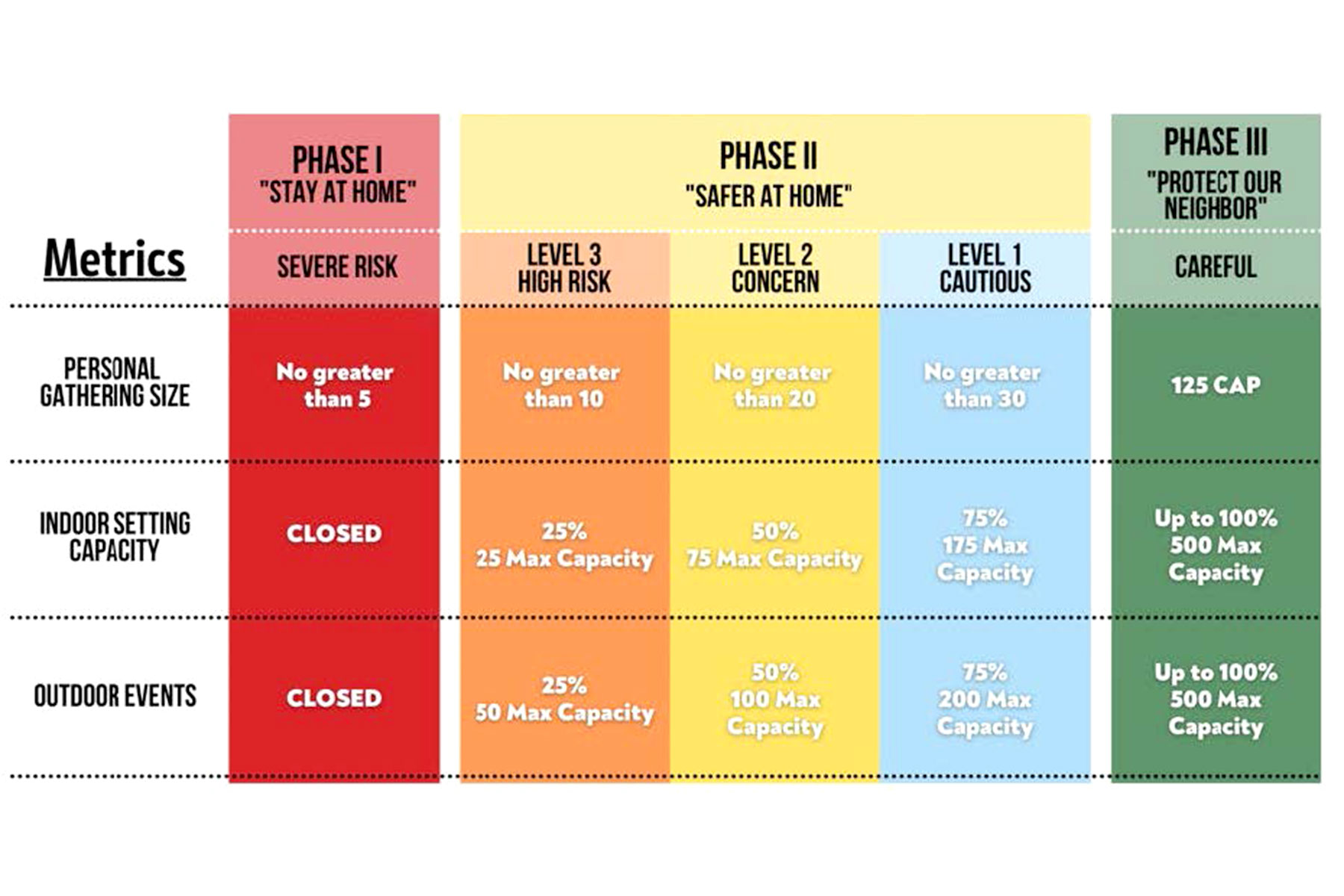 Below are examples of capacity restrictions when the Tribe moves to Phase III “Protect Our Neighbor.”