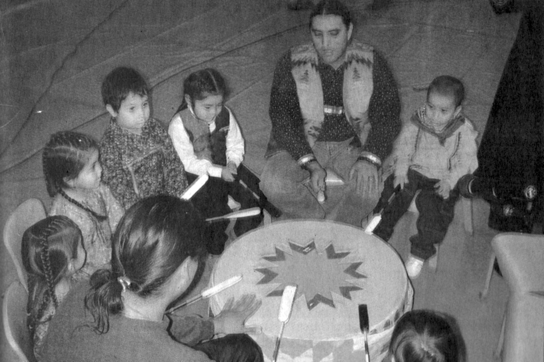 Many Moons 20: Pictured are one of two drum groups from the Southern Ute Academy who delight the audience with its performance during the Tribal Christmas Program on Dec. 14, 2001 in the SunUte Community Center gymnasium. All drum groups were under the direction of academy counselor John Oberly.