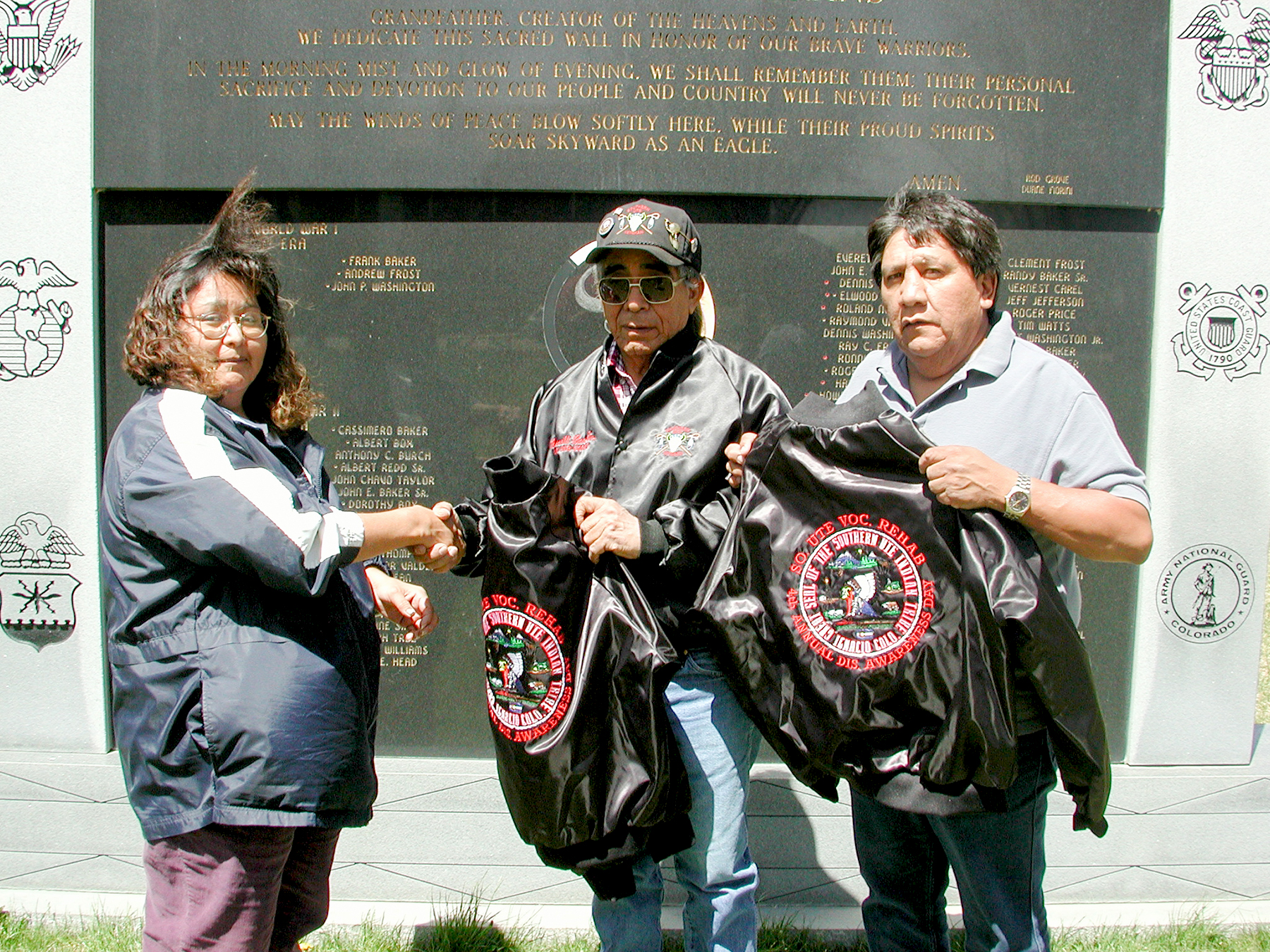 On April 24, 2002, the Southern Ute Veterans donated jackets to the Vocational Rehabilitation Program for the May 9 basketball “Shoot Off” held at the Ignacio Junior High School. Veteran Russel Box and Southern Ute Veterans Service Officer Rod Grove presented the jackets to Wilinda GoodTracks of Vocational Rehab. This photo first appeared in the May 3, 2002, edition of The Southern Ute Drum.