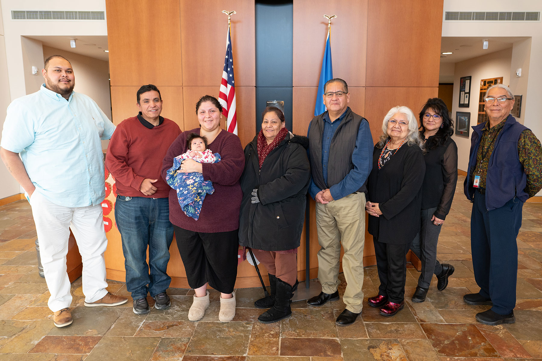 Southern Ute Tribal Council gather with the family of new enrollee Emmalena Baker-Valdez in the Hall of Warriors on Tuesday, Feb. 20 following the announcement and approval of her enrollment during the Tribal Council Regular Meeting. Baker-Valdez is joined by mother Amber Baker-Valdez and grandmother Dorene Baker.