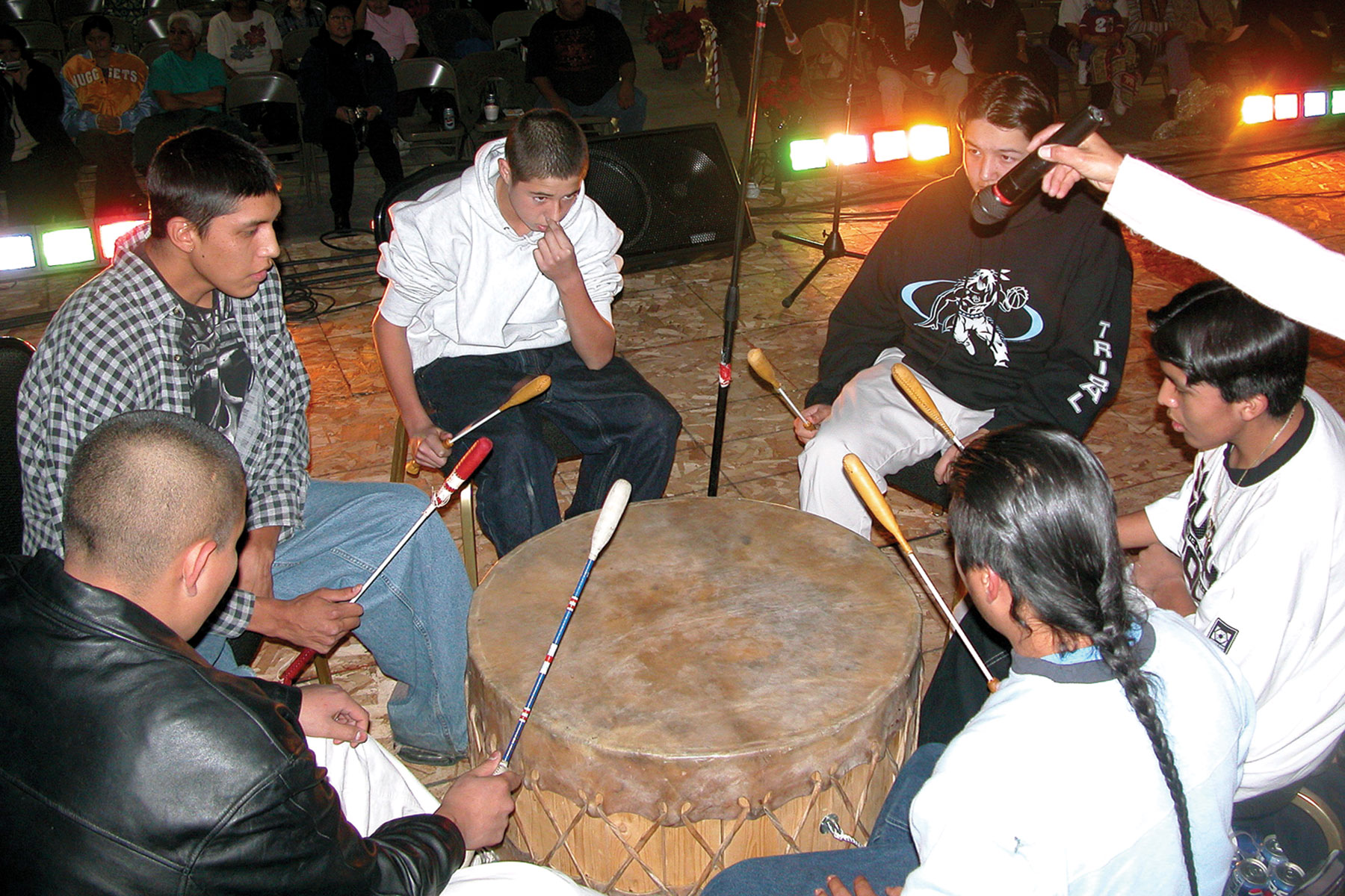The local youth drum group, which had yet to adopt a name, opens the Tribal Christmas Program at the Sky Ute Pavilion on Thursday, Dec. 9, 2004.