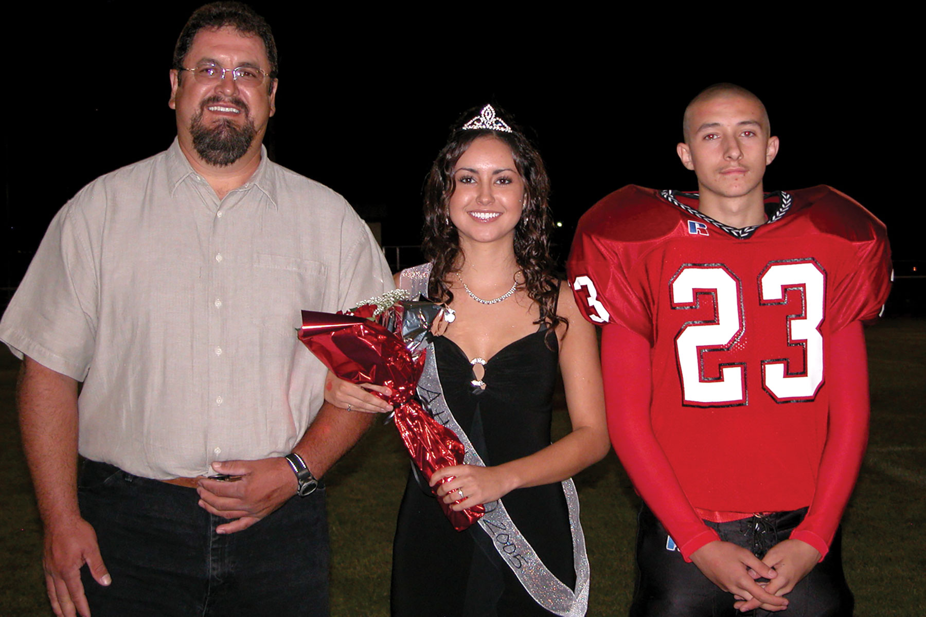 Kasey Lucero (right) crowned First Attendant Shonda Abeyta (center) Friday night, Sept. 23, during halftime of the IHS Homecoming Game. Shonda is the daughter of Preston (left) and Angela Abeyta. Kasey’s parents are Lori and Ray Lucero (not pictured.)
